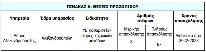 Στην πρόσληψη, με σύμβαση εργασίας ιδιωτικού δικαίου ορισμένου χρόνου, συνολικά 95 ατόμων για την καθαριότητα σχολικών μονάδων στο Δήμο Αλεξανδρούπολης θα προχωρήσει ο Δήμος Αλεξανδρούπολης.