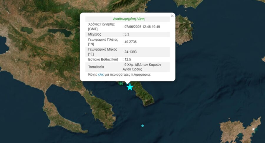 Σεισμός 5,3 Ρίχτερ σημειώθηκε λίγο πριν τις 3 μ.μ. στο Άγιο Όρος. Σύμφωνα με το Γεωδυναμικό Ινστιτούτο, ο σεισμός σημειώθηκε στις 15:46 ώρα Ελλάδος, 9 χλμ. δυτικά – βορειοδυτικά των Καρυών Αγίου Όρους, με εστιακό βάθος 12 χλμ.