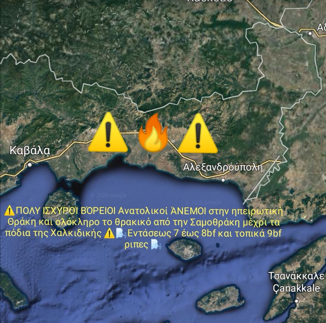 Μπορεί ο Ιανός να μην προκαλέσει καταιγίδες και πλημμύρες στην περιοχή του Έβρου και της Θράκης, ωστόσο η περιοχή μας τίθεται σε νέο συναγερμό λόγω των πολύ ισχυρών βοριάδων που από σήμερα ενισχύονται σταδιακά. Όπως αναφέρει η ομάδα του facebook “Καιρικά νέα Θράκης”,  ενισχύονται εκ νέου οι βόρειοι ανατολικοί άνεμοι σε Θράκη, παραλία αν. Μακεδονίας και σε ολόκληρο το θρακικό από την Σαμοθράκη μέχρι τα πόδια της Χαλκιδικής. Η ένταση τους θα είναι 7bf. έως 8bf τοπικά ίσως και παραπάνω. Ο κίνδυνος εκδήλωσης πυρκαγιών από σήμερα μέχρι αύριο το βράδυ σε όλες τις περιοχές αυτές είναι πολύ μεγάλος. Επίσης, μεγάλη προσοχή θα πρέπει να δείξουν και τα μικρά σκάφη που έχουν σκοπό να ανοιχτούν στο θρακικό από τη νύχτα.