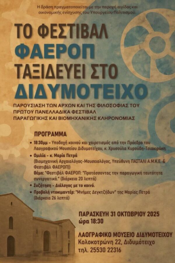 «Το φεστιβάλ ΦΑΕΡΟΠ ταξιδεύει στο Διδυμότειχο: Παρουσίαση των αρχών και της φιλοσοφίας του πρώτου πανελλαδικά φεστιβάλ παραγωγικής και βιομηχανικής κληρονομιάς», στοχεύει στην ενημέρωση και ευαισθητοποίηση του κοινού για τη σημασία της διαφύλαξης και της αξιοποίησης της πολιτιστικής και βιομηχανικής κληρονομιάς της χώρας.
