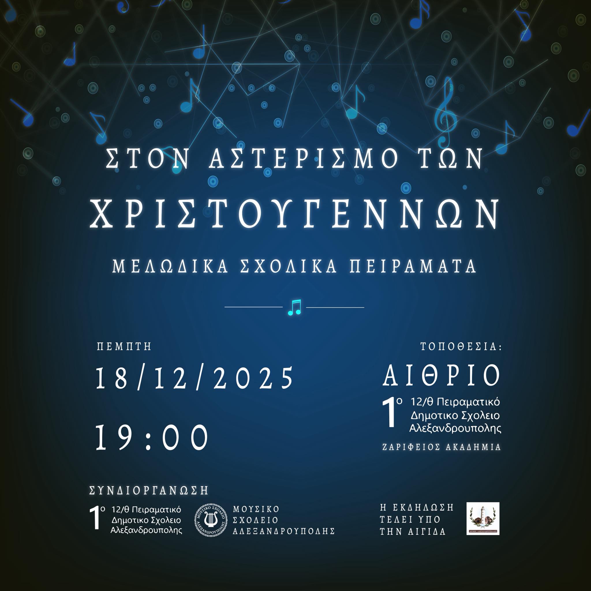 18 Δεκεμβρίου 2025, 19:00 Αίθριο 1ου Πειραματικού Δημοτικού Σχολείου Αλεξανδρούπολης (Ζαρίφειος Ακαδημία)